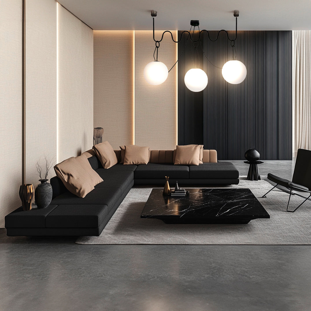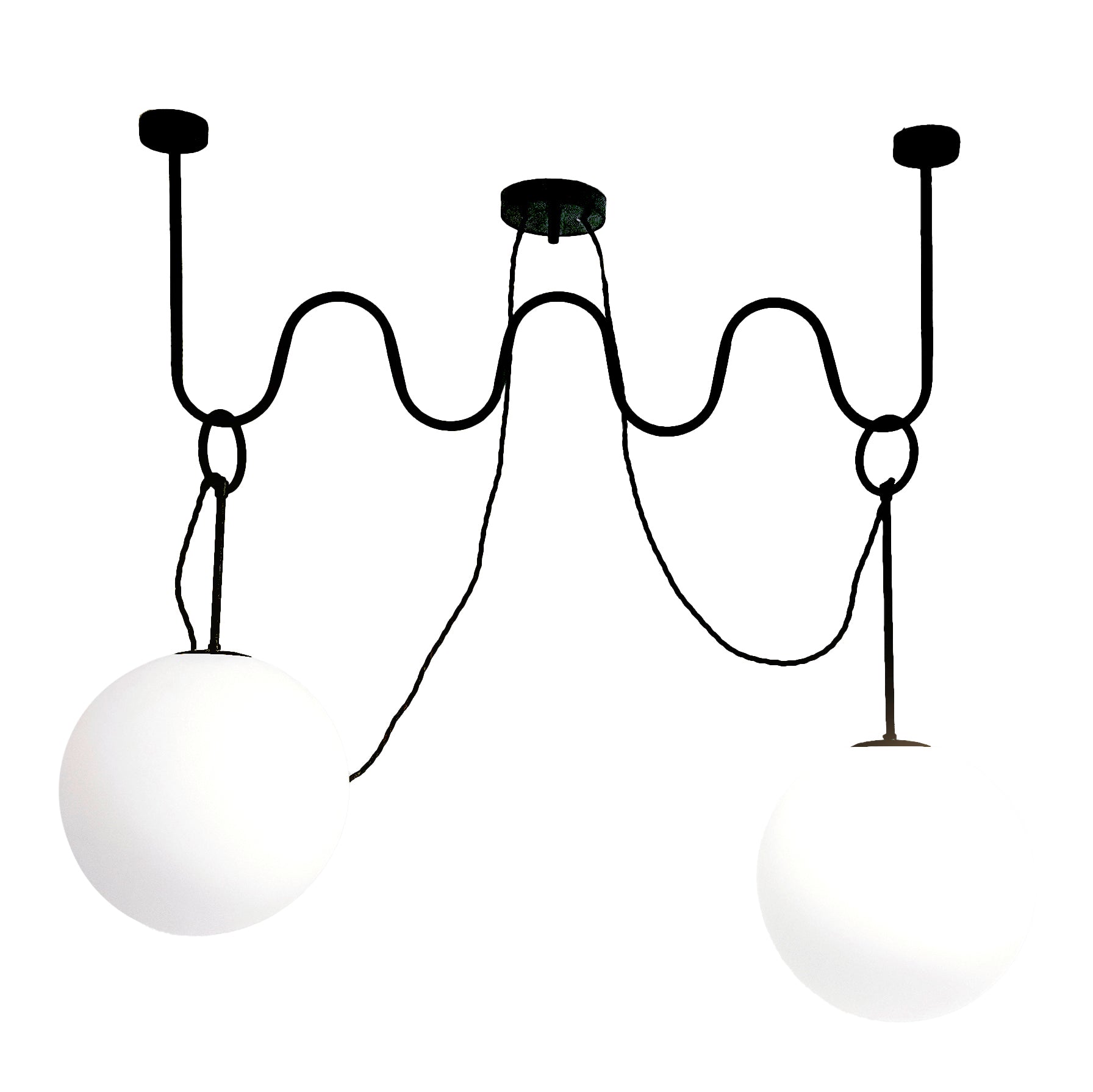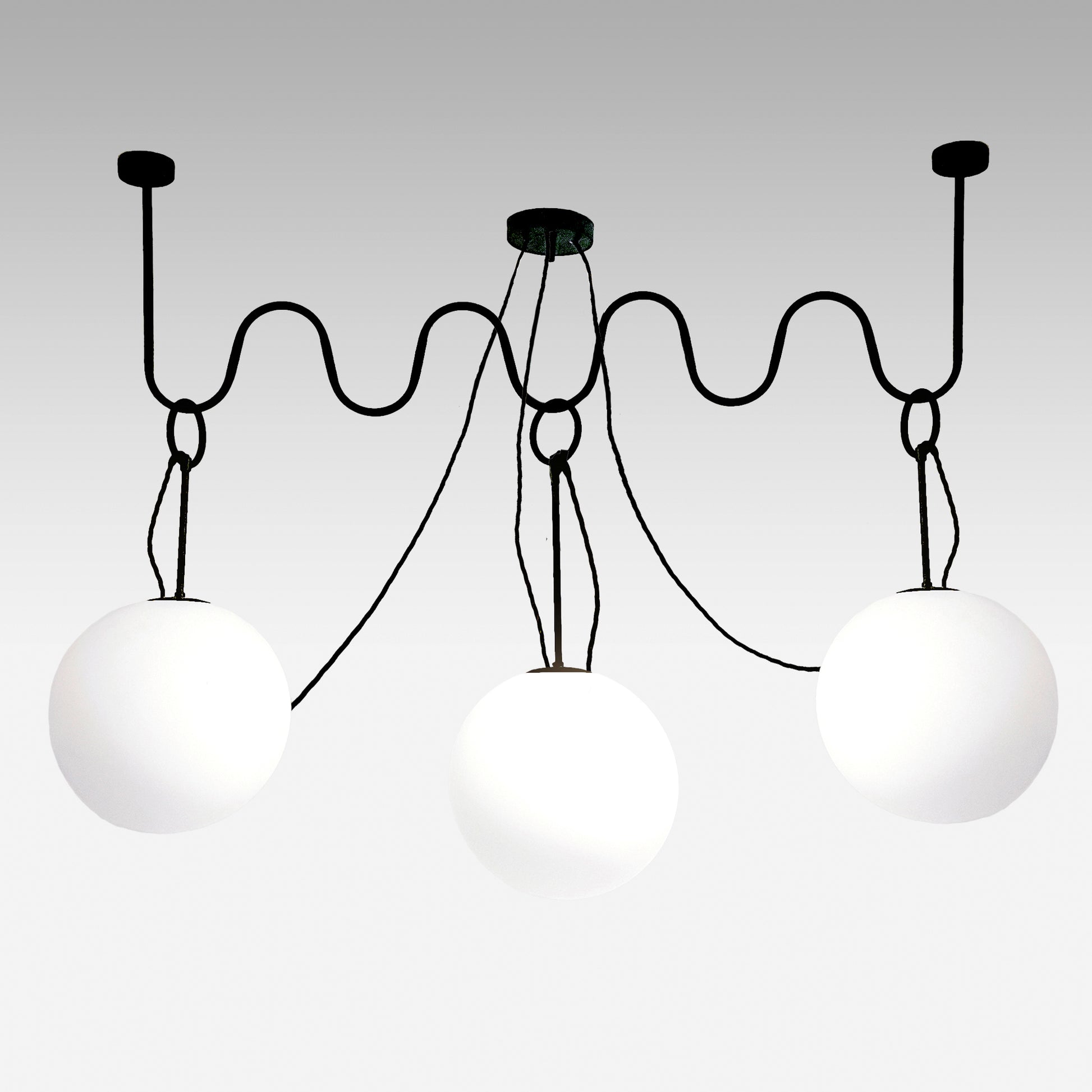 La lampada è costruita con una struttura in metallo nero opaco e sfere in vetro opalino di alta qualità. I materiali pregiati assicurano durabilità e un'illuminazione morbida e diffusa, ideale per ogni tipo di ambiente. Non solo un'illuminazione funzionale, ma un elemento di design che elevato ogni spazio, offrendo un comfort visivo ideale per la casa o l'ufficio.
